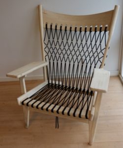Kunden havde selv ordnet træet på sin stol, der oprindeligt var i rødmalet bøgetræ. Den gamle maling har kunden fjernet og træet er blevet hvidolieret. Vi tilføjede ny, sort flaglinesnor – det var, som altid, en spændende opgave at flette sådan en speciel stol som denne, som vi ikke ser så mange af.