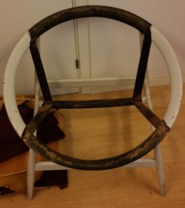 På nettet kunne jeg se flere billeder af stolen med fletværk i stedet for polstring – en helt anden stol! Jeg besluttede mig derfor for at renovere den, og resultatet kan I se nederst på siden. Med den slitage, som tidens tand havde givet stolen, var det nødvendigt at skille den helt ad og dernæst genskabe den.
