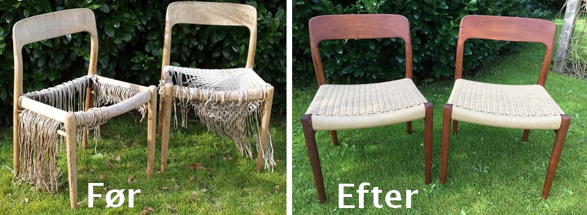 Stolene er blevet renset af, slebet, limet, olieret, poleret og så et nyt planflet sæde. Teaktræet har fået sin glød igen.