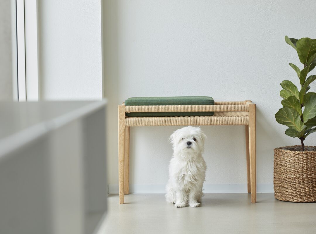Bænken er fremstillet i egetræ, med planflet i papirsnor og en tilhørende hynde der passer perfekt i den fine ramme. Hynden er betrukket med et lækkert uldstof, remix fra Kvadrat.